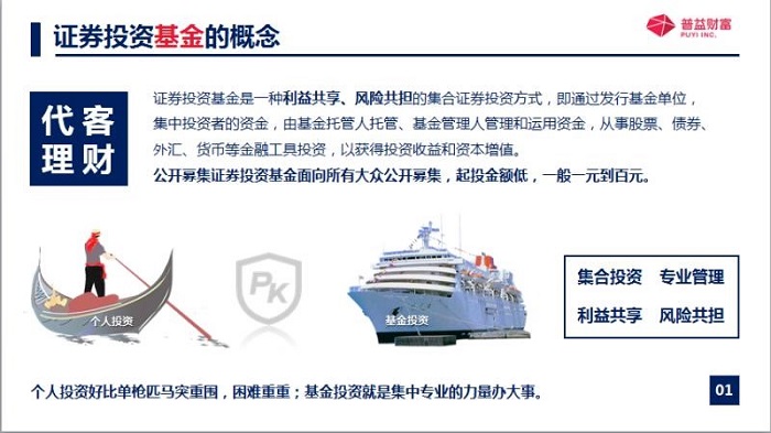 把這些資金呢投資于股票債券外匯貨幣等金融工具的一種集合投資方式,也就是說不止投資單一只股票,也不止投資單一只債券,而是投資多只股票或者多只債券的一種集合投資方式,極大地分散的風(fēng)險(xiǎn),因?yàn)樵蹅兌贾离u蛋不能放在同一個(gè)籃子里面,并且呢,公募基金是面向所有大眾公開募集的,起投金額是比較低的,一元起投呀,百萬元起投呀,千元起投。這對(duì)于很多投資者來說呢,都是可以接觸的到的,那如果說拿個(gè)人投資跟基金投資進(jìn)行比較的話,就像在海里面航行一樣,個(gè)人投資就像一個(gè)孤身備戰(zhàn)的小姑船一樣,那基金投資,因?yàn)樗澈笥幸徽麄€(gè)團(tuán)隊(duì)進(jìn)行運(yùn)作,那他的專業(yè)非常強(qiáng),所以呢,它就是集中專業(yè)的力量辦大事。