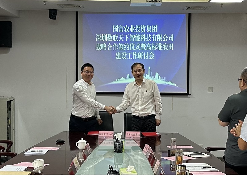 7月2日,國富農(nóng)業(yè)投資集團(tuán)與深圳數(shù)聯(lián)天下智能科技有限公司簽訂戰(zhàn)略合作協(xié)議,為國富農(nóng)業(yè)投資集團(tuán)加快培育農(nóng)業(yè)新質(zhì)生產(chǎn)力、打造省內(nèi)一流高標(biāo)準(zhǔn)農(nóng)田建設(shè)項目注入科技新活力。國富農(nóng)業(yè)投資集團(tuán)黨委副書記、副董事長、總經(jīng)理張立忠,集團(tuán)黨委常委、常務(wù)副總經(jīng)理馬國棟,集團(tuán)黨委委員、副總經(jīng)理李其強(qiáng),及相關(guān)業(yè)務(wù)骨干同數(shù)聯(lián)天下副總裁鄧才良一行進(jìn)行工作研討并見證簽約儀式。