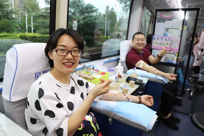 這些獻血員工當(dāng)中,有的是多次參加無償獻血的老同志,也有剛參加工作不久的新員工,其中不乏巾幗不讓須眉的女同志。“這是我第一次獻血,在國慶節(jié)到來之際能奉獻自己的一份愛心,感覺很有意義?!眹煌顿Y集團黨群工作部經(jīng)理李杰自告奮勇第一個走上前。員工李帥早早地就過來排隊,這已經(jīng)是他第三次獻血了?!拔迥昵霸诓┪镳^廣場看到獻血車,就上去獻了第一次血,后來就停不下來了?!崩顜浉嬖V記者。